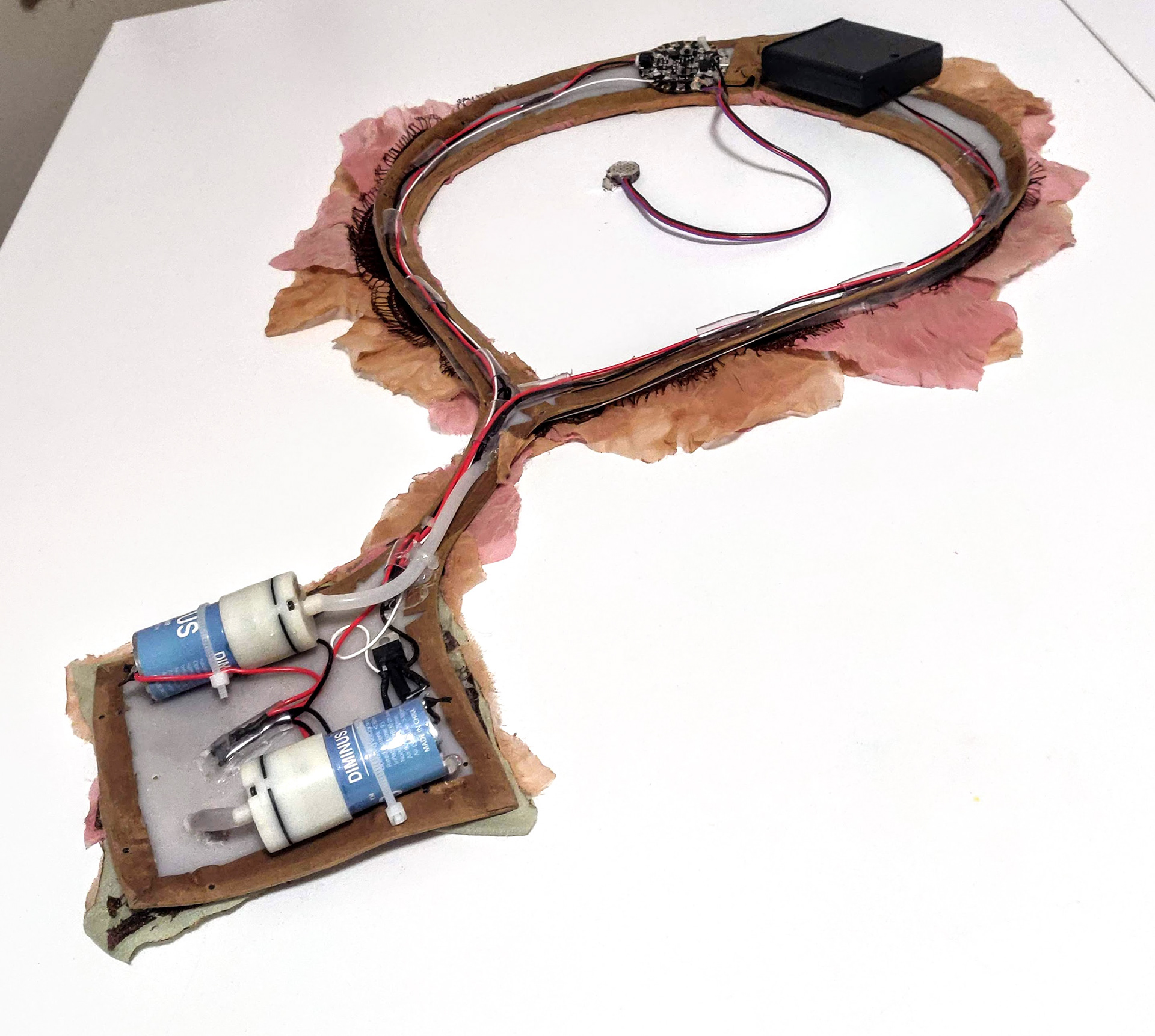 How it works is that there is a pulse sensor that feeds data to a microcontroller, in this case a circuit playground, which is an easy microcontroller to use for beginners and code can be uploaded via a USB cable. The circuit playground outputs a signal to a transistor that turns two air pumps on, to inflate an air bladder that makes this scaly part move and look like it’s breathing. The whole system is powered by 4 AA batteries in this battery pack. The reason it revolves around breathing is because the code that’s running the system is code I borrowed from an open source platform called Adafruit that was created for a meditation trainer. The code takes the data from the pulse sensor, reads your current heart rate and uses many lines of mathematics to compute if you are in a calm state. There is a breath pacer that is running at the same time to guide your breathing for you to maintain a calm meditative state. If you are successfully keeping your heart rate relatively even and stable, the top two onboard neopixels on the circuit playground turn green, when your breath and HR destabilizes, these lights will turn blue then red. I altered the meditation trainer code to turn the two air pumps on when the light turns red and you are theoretically in a less than very calm state.